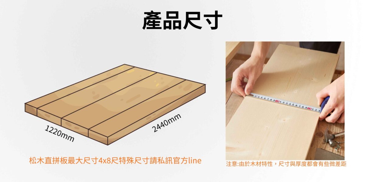 商品名稱:松木直拚板商品材質:紐西蘭松木商品尺寸:實際尺寸請以商品標示尺寸為主,裁切都會有些微差異。如何保存:避免陽光直曬及存放潮濕,建議不使用時利用保鮮膜封存或是上漆保護。特殊說明:松木材質由於環境氣候因素,可能收到貨會有變形或蹺曲的狀況,可以平放並壓上重物保持通風。 尺寸 30x20cm, 30x60cm, 30x45cm